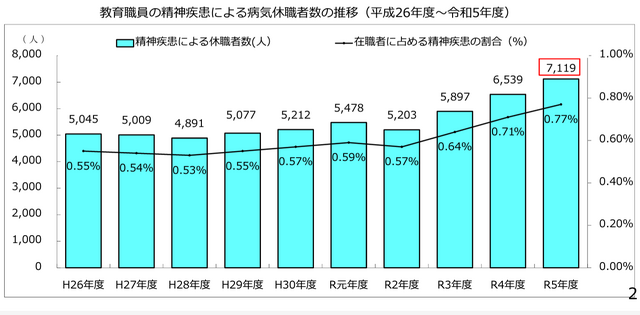 2023年度に精神疾患で休職した公立校の先生は7,119人。
