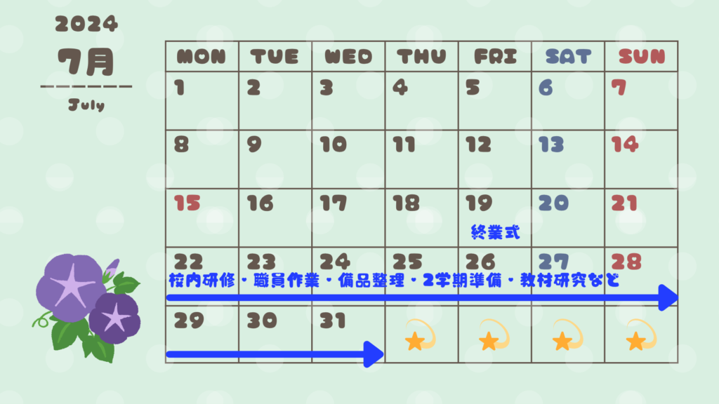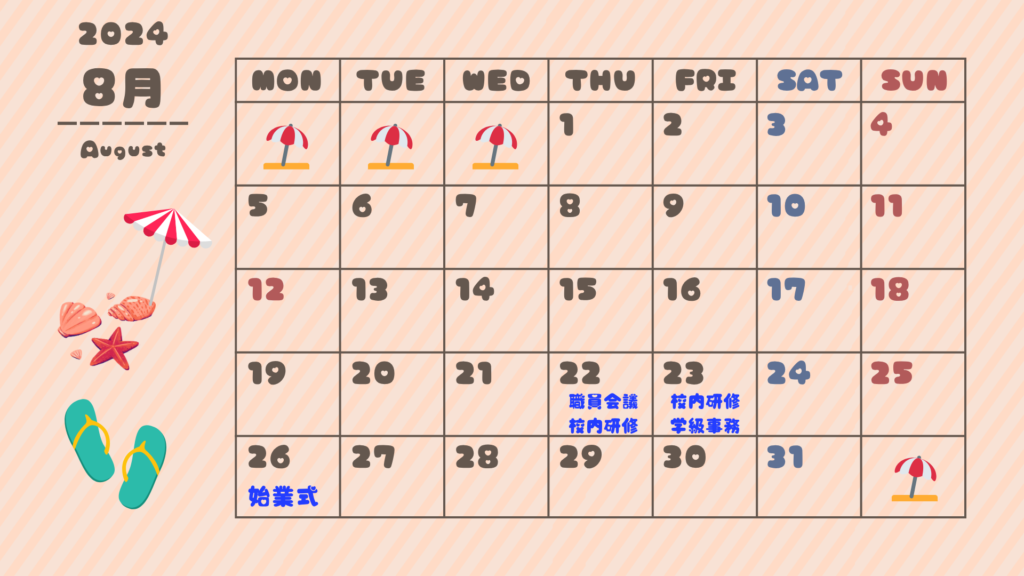 夏休み最初の数日と、2学期が始まる直前は備品整理・校内研修・職員会議が集中しやすい時期。