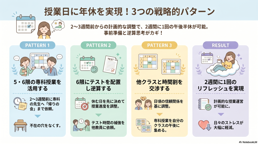 専科の先生の時間割を入れ替えてもらうことで午後年休を生み出すパターン。