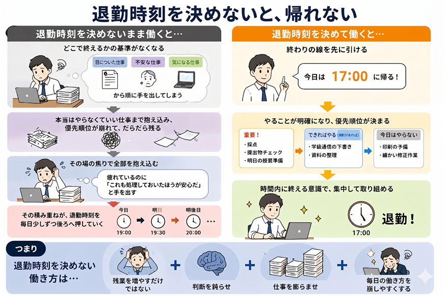 「終わってから帰る」では、教員は定時退勤できない