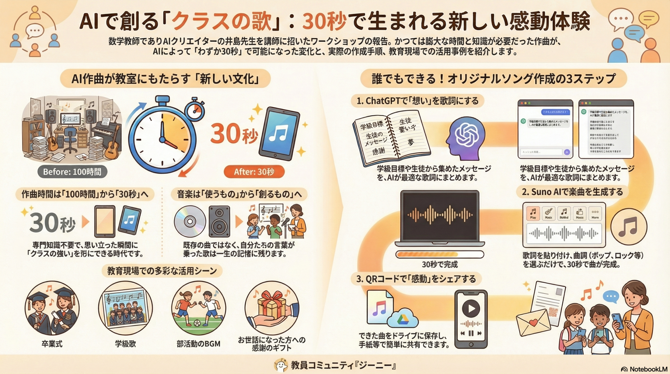 AIを活用して「クラスの想いを音楽にする」という、これまでにない教育実践に挑戦する場です。